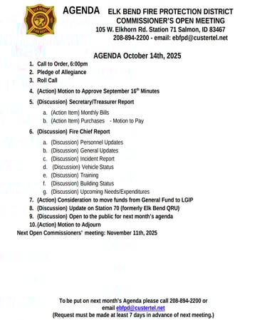 We are a volunteer fire department committed to protecting and serving the Elk Bend, Idaho community with courage, dedication, and professionalism. Currently accepting applications for both Combat and Support Services positions.
